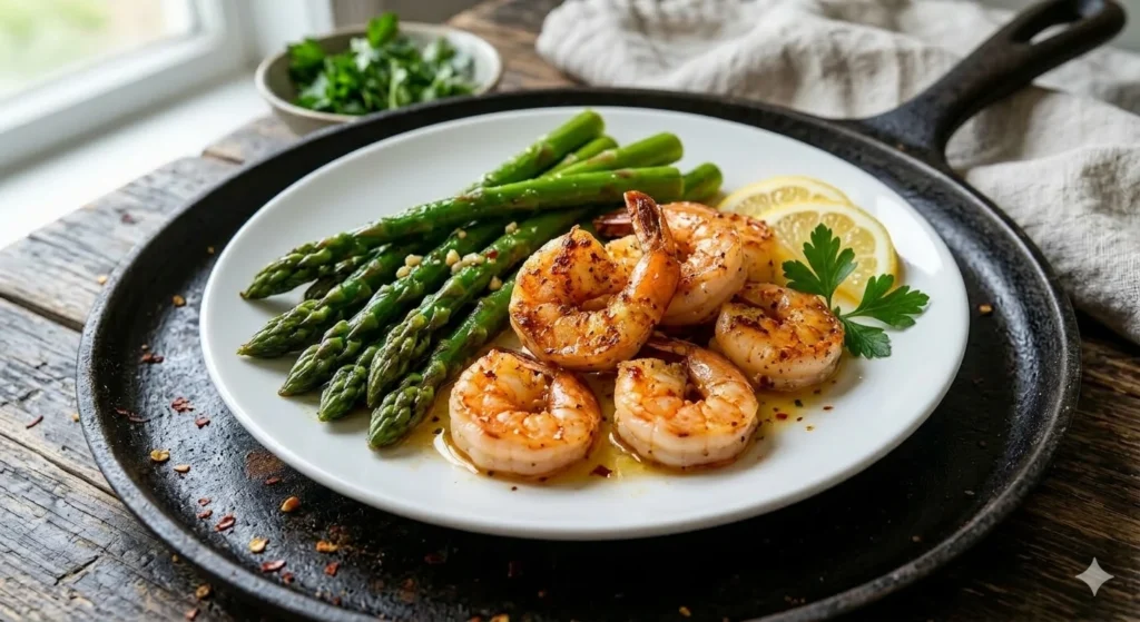 - Bring the shrimp and asparagus back to the pan, tossing them in the bright lemon-garlic butter for about a minute. Serve immediately with warm garlic bread, or over a bed of fluffy orzo.